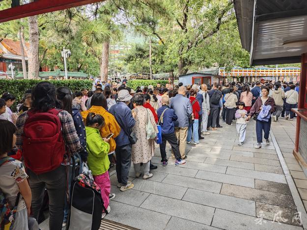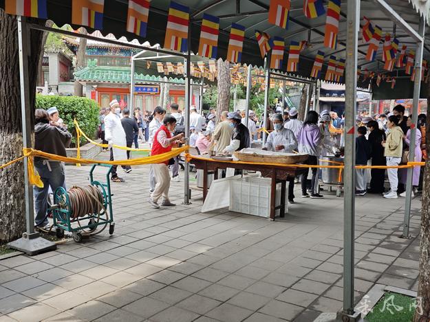 拐进塔院,还没开饭。食客比预想的多得多;起码有五六百人,四列长队,弯弯曲曲地,从新塔前的凉棚一直排过旧塔的后面,并且不断有新人加入,队尾在迅速地延展着。人声鼎沸,秩序较好,表情兴奋、好奇、期待。