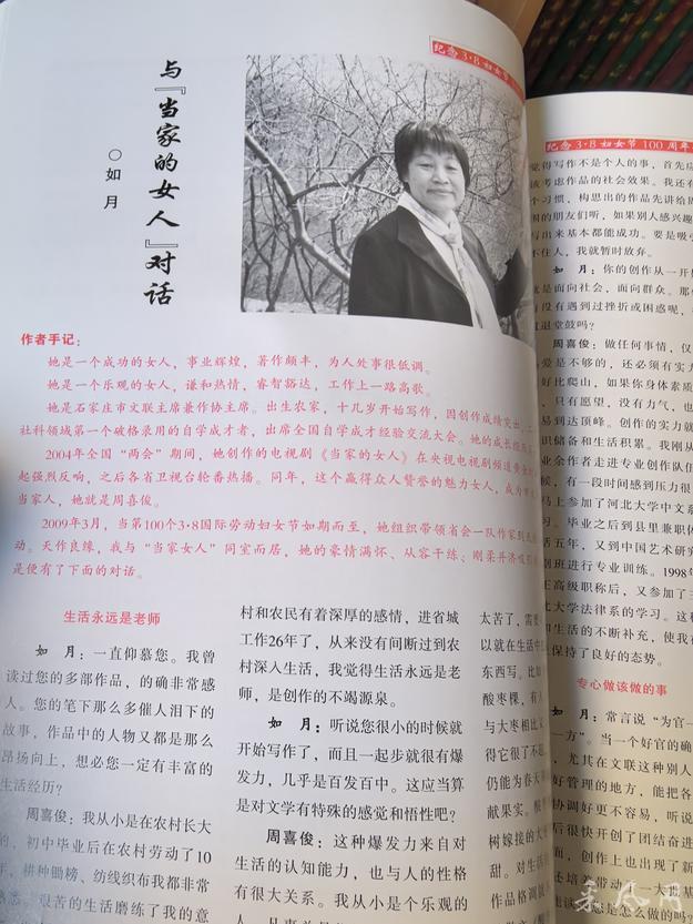 周喜俊是国家一级编剧、作家从事创作50年,发表各类文学作品一千万字。早在2004年全国两会期间,周喜俊创作的电视剧《当家的女人》在央视黄金频道播出,在全国引起强烈反响,之后各地各省市卫视台轮番热播。那时候,我在石家庄市委办公室从事文秘工作,我们文秘人员当中许多人也有文学情怀,有不少文学追梦人,因为他们整日写公文,有时感到枯燥了疲惫了也喜欢写一些诗文,换一种心境。所以,我们办的杂志《秘书战线》(我时任副主编)也开设了文艺类栏目。正是在周主席的感召下,我也加入了市作协。她经常带领我们深入农村工厂采风创作。2009年3月,在“三八”国际劳动妇女节100周年之际,我有幸采访了这位《当家的女人》的著作人。记得那是一次天赐良缘,是在周主席带领我们在天桂山采风的活动中,我们俩同居一室,如此近距离接触这位自己崇敬爱戴的女作家,是我的荣幸。她的热情豪情,她的从容干练,她的刚柔并济使我一下子产生了采访她的冲动。于是我们促膝长谈至深夜,开展了一场女主编与“当家的女人”的对话。此篇访谈发表在我刊2010年第2期,当时在秘书界引起了很大的反响,我自己更是受益匪浅。