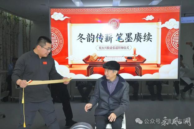 随后介绍弟子张超。他身兼三河市后葛庄村书记兼主任、京仁博爱口腔医院市场部经理等职,扎根基层、深耕医疗。同时担任北京漕运书院相关职务,搭建医疗与传统文化融合桥梁,推动文化扎根乡村,尽显担当。核心拜师环节庄重有序。张超宣读呈上拜师帖,向窦万兴敬茶行三鞠躬礼;窦万兴宣读回徒帖,师徒互赠礼物,承载传道授业与文脉赓续之盼,现场掌声热烈。参加活动的领导、嘉宾等(序次不分先后):华敬俊、张希芳、刘学力、邓东林、张德海、张维民、窦万兴、许进豪、张宗洪、瞿进、魏斗、赵春梅、袁静华、董亚生、郑景泉、乾雍、刘维嘉、郭建华、张丽、王宝川、田海英、刘玉国、孙确东、赵劲松、周付永、杜福栋、马宝田、张超、彭国明、王金友、扶超、武辉然、杜德寅、李文霞、马俊奎、王庸等。