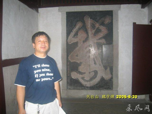 没想到在国清寺避雨时,那个从上海锦江饭店来出家的91岁的了缘大师告诉我们:当年王羲之写的"鹅"字碑就在这里。并带我们到三圣殿左边一处回廊的转角处去看那尊字碑。介绍说那碑的一半是王羲之的真迹,另一半是后人补上去的,让我们辩认哪真哪伪,说真的,当实我们一行三人谁也没有辩认出来。待问那师傅时,大师但笑不语。