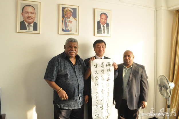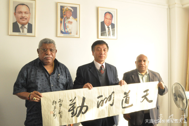 近日杜辉煌先生在同郝连成、秦国仁等艺术家拜访巴新驻中国大使馆进行文化交流时,又把中国著名的书法吉尼斯世界记录创造者秦国仁先生的书法瓷盘《厚德载物》、书法作品《一苇可航》。知名书法家郝连利的作品《天道酬勤》《海风吹白练》等艺术作品,通过梅罗大使转赠给巴布亚新几内亚人民。祝贺巴布亚新几内亚参与到中国习近平主席倡议的“一帯一路”经济发展的伟大战略中来。