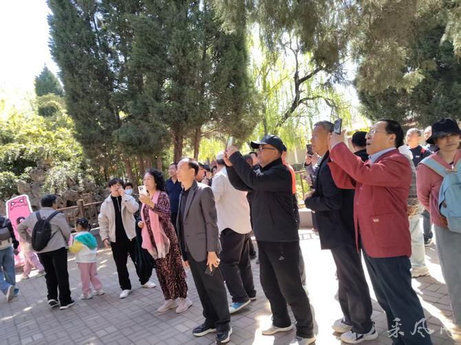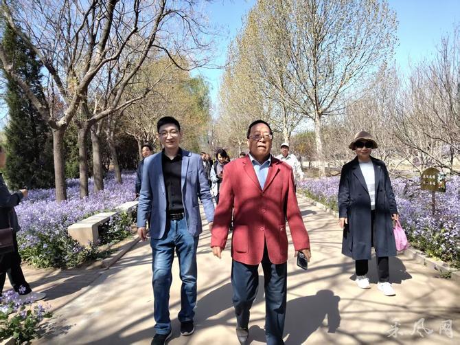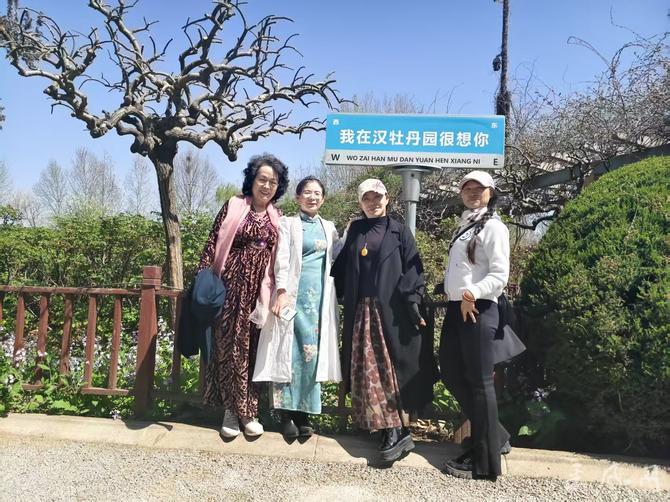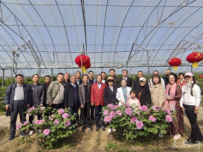 采风人员抵达后,牡丹园董事长贾树粉亲切接见大家并安排优秀讲解员带领大家在园内采风观光。大家缓步寻芳,依次游览了温室牡丹、牡丹芍药仙子广场、四季花卉园、神花苑、碑廊等景点。在大棚内但见千株牡丹竞放,万蕊争辉,“曹州红”“映日红”等名品叠翠流霞,红若燃霞、艳若凝脂,微风过处,暗香浮动。众人或驻足凝视,细观瓣脉之姿、花容之态;或举机定格,捕捉盛放瞬间;或与花留影,沉醉其中。采风人员行至四季花卉园时,二月兰紫韵悠然,连翘金英烂漫,桃花粉靥含笑,丁香素洁含香,姹紫嫣红,满目芳菲,令众人心旷神怡。到达神花苑时,采风人员近距离观赏汉代牡丹的风姿,聆听刘秀避祸护花的千古传说,了解牡丹“同株异花、异地不活”之奇特,感受其蕴含的忠贞气节与文化灵气。