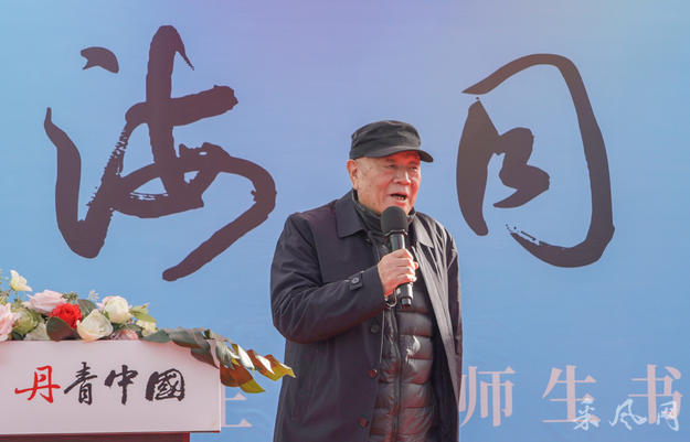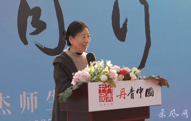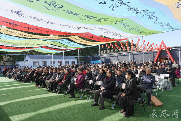 开幕式广场,最先攫住观众目光的,是广场上空铺展的绚丽奇观——王士杰老师以五种颜色的缦布为材,用巨幅草书将自撰的记述办展历程的长诗,凌空绘就成一幅天幕长卷。诗中娓娓道出从发心立愿、辗转筹备到终有所成的心路历程,笔墨酣畅,气势如虹,在广场上空构筑出一道流动的诗歌长廊,成为开幕仪式中最动人的视觉焦点。