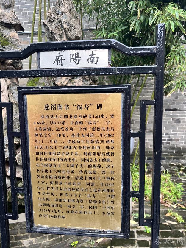 附记:南阳府衙始建于元世祖至元八年(1271年)。现存古建筑30多座共140余间,总体布局依然保留着明清时期的格局和风貌。有慈禧亲笔“福寿”碑等诸多文物史迹。北宋庆历五年范仲淹在邓州(今属南阳市)做知州时应滕子京之邀写出千古名篇《岳阳楼记》。