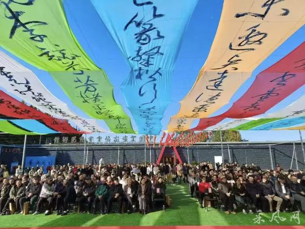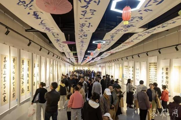 开幕式现场的布置就是神来之笔——在西集国际艺术园区的露天,1000多平的会场上方被五彩绸幅覆盖成天幕,绸幅上是用地书笔草书的《兰亭序》全篇。微风拂过,天幕抖成一排排缤纷的字浪——太壮阔了!太有创意了!我一向认为震撼的效果只属于“运河音乐节”这样的动感艺术,而静态的书展居然也震撼起来了,我从没见过,确实颠覆了我对艺术形式的认知。更有意思的是,这一创新并非刻意的匠心独运,而是妙手偶得。王士杰先生最初只是想弄个天幕遮阳,又突发奇想:既然是书法展为什么不在上面写字呢?于是,便把绸幅铺在地上奋笔五六个小时;于是,便有了露天的和展厅内的草书五彩天幕,成就了一个人人喝彩叫绝的奇观。其实,这种妙手偶得不是凭空而得,而是长期艺术积累才有的灵光一现,是一种必得。