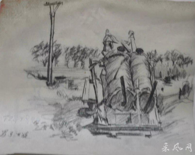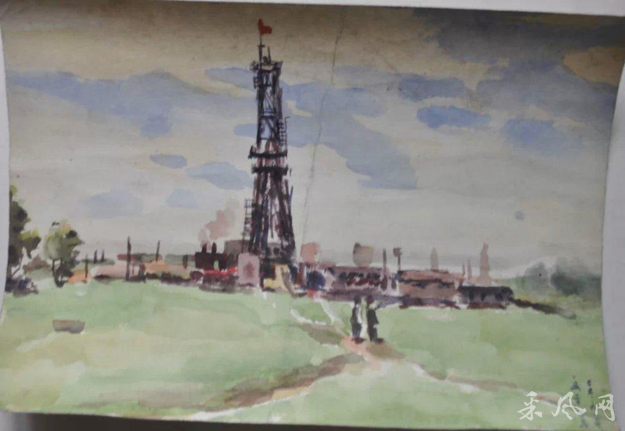 在郝连利为数不多的几篇画稿里《钻井》是一幅水彩画,当年是双鸭山矿务局110钻井队为九连打井抗旱时的场面。辽阔的原野,高天塔架,草绿天蓝。虚现的人影使画面有了动感和灵气。这幅作品没能完稿,但郝连利印象很深,因为他在画一半时被领导找回去写“反击右倾翻案风”的大批判稿子去了。