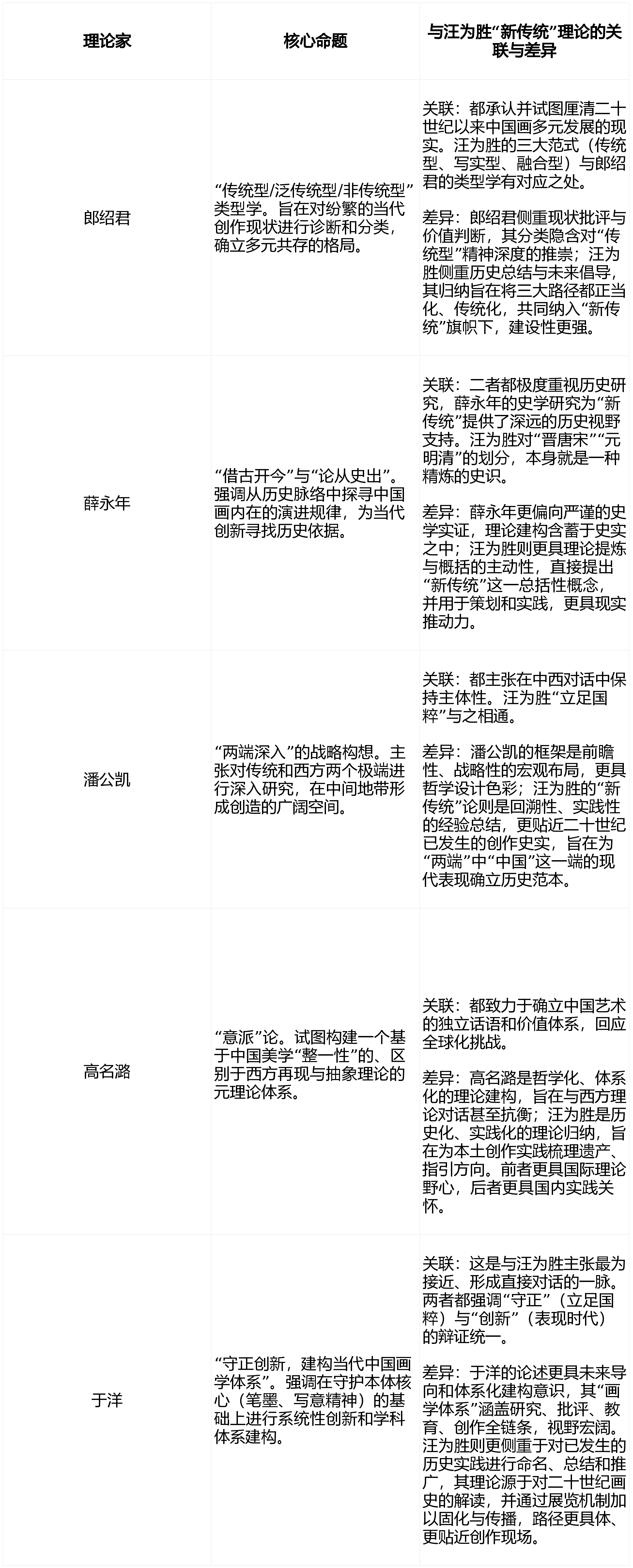 与郎绍君侧重于批评与分类的研究路径相比,汪为胜的理论呈现出更强的建构性与主动性;相较于薛永年注重史实梳理与文献考证的研究方式,其理论更具高度的概括性;而与潘公凯、高名潞等人倾向于宏大叙事和哲学思辨的理论体系相比,汪为胜的论述更贴合艺术实践,具有显著的可操作性与具体性;相对于于洋提出的系统性蓝图与理想架构,“新传统”理论更注重从历史经验和现实语境中获取支撑,展现出更为坚实的历史基础。